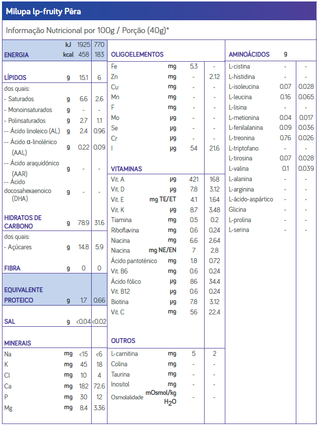 Maltodextrina, farinha de arroz, farinha de milho, óleos vegetais refinados (palma, colza, coco, girassol), açúcar, amido (batata e milho), pera em pó (1,89%), laranja em pó, carbonato de cálcio, emulsionante (ésteres de mono- e di-glicéridos de ácidos gordos), ácido L-ascórbico, pirofosfato férrico, nicotinamida, acetato de retinilo, L-carnitina, palmitato de ascorbilo, colecalciferol, mononitrato de tiamina, acetato de DL-a-tocoferilo, D-pantotenato de cálcio, cloridrato de piridoxina, riboflavina, ácido pteroilmonoglutâmico, iodeto de potássio, D-biotina, fitomenadiona, cianocobalamina.
