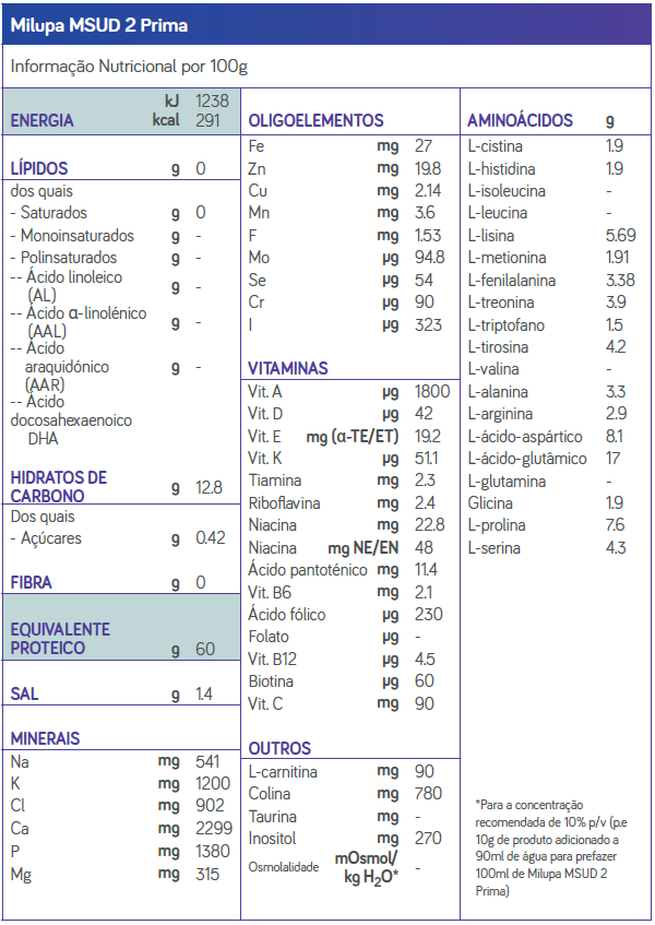 Alimento para fins medicinais específicos. Indicado para a gestão nutricional de leucinose, em crianças a partir de 1 ano de idade. Mistura de aminoácidos em pó, isenta de isoleucina, leucina e valina, com hidratos de carbono, vitaminas, minerais e oligoelementos.